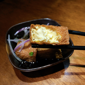 外皮吃起來是有點像台灣傳統的臭豆腐,但請你豪邁的咬下去!