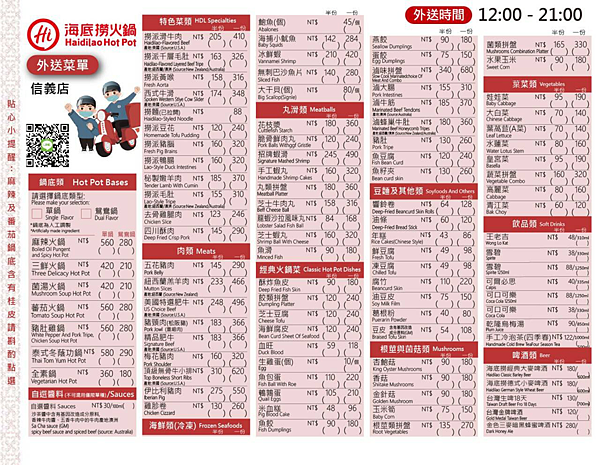 先附上海底撈的外送菜單給大家參考,基本上差最多的就是沒有四格鍋,會改成鴛鴦鍋