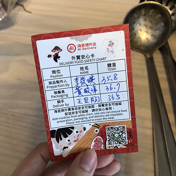 在外送員出餐之前,都會先給客人看這個外送卡,證明外送員都有先行量過體溫~