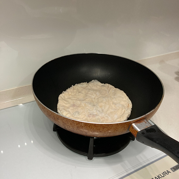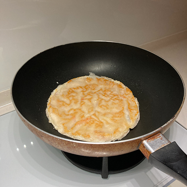 所以在煎柴米夫妻的月亮蝦餅&蔥油餅時,一定要加油煎,中小火慢煎,約10秒翻面一次(如下)